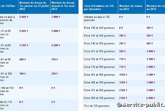 Parmi les principaux changements par rapport à 2012, le seuil de passage du bonus au malus est fixé à 140 g au lieu de 135 grammes de CO2 par kilomètre. Quant au montant maximal du malus, il est passé de 3 600 euros à 6 000 euros pour les véhicules émettant 230 grammes de CO2 ou plus par kilomètre. Concernant le bonus, le montant maximal de l'aide est monté de 5 000 à 7 000 euros. Elle peut être additionnée à un superbonus de 200 euros si l'achat s'accompagne de la destruction d'un véhicule de plus de quinze ans (voir détail du barème, ci-dessous).