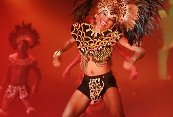 Tout d’un coup, un cortège bariolé et atypique investit la coursive, et passe tout près du public. Ce dernier, conquis par ces animaux merveilleux tend les mains pour les toucher. Les artistes déguisés, paradant avec les drapeaux de tous leurs pays, se mettent à la portée de l’assemblée, qui leur rend leur sourire avec sympathie et admiration. Ainsi embarqués, nous découvrons plus tard, la danse sud africaine zouloue dite « gumboots » issue de l’histoire des miniers de cette région, elle est présentée avec une énergie viscérale qui est communicative. L’assistance est d’ailleurs mise à contribution, et les artistes parviennent à réaliser le tour de force d’instaurer avec un aussi grand nombre de personnes une relation de proximité. Ainsi pendant deux heures, nous en prenons plein les yeux et les oreilles, et l’envie nous démange de danser avec eux.