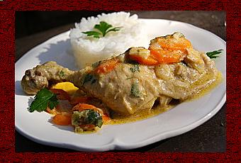 Servir le poulet avec un riz blanc.