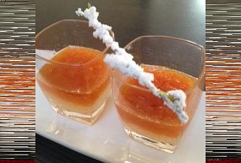 Dans un verre transparent, verser la crème de tapioca et ajouter le coulis de pamplemousse