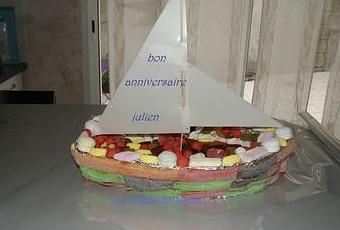 Pour les 10 ans de mon neveu Julien, j'ai confectionné ce bateau de bonbons et un petit gâteau au chocolat avec un glaçage à l'orange parsemé de confettis comestibles rapportés du Brésil par mon amie Gildéne .