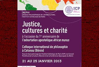 À l’occasion du premier anniversaire de l’Exhortation Apostolique Africæ Munus, sur « l’Église en Afrique au service de la réconciliation, de la justice et de la paix », signée par le Pape Benoît XVI à Ouidah (Bénin) le 19 novembre 2011, l’Institut Catholique de Paris, le Conseil Pontifical de la Culture, la Délégation du Bénin à l’UNESCO, l’Université Nationale d’Abomey-Calavi, l’Université Catholique de l’Afrique de l’Ouest et l’Université Catholique de Yaoundé co-organisent à Cotonou (Bénin), du 21 au 25 janvier 2013, un colloque international de philosophie sur le thème « Justice, cultures et charité ».