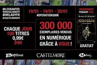Pour fêter les 300 000 exemplaires vendus, du vendredi 18 au dimanche 20 janvier, l’éditeur Bragelonne et ses labels proposent 300 titres de son catalogue numérique à raison de 100 titres par jour au prix exceptionnel de 0.99₏.
