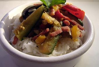Pour 2 à 3 personnes : 125g de riz basmati, 250g de légumes grillés surgelés, 1 oignon, 50g de lardons de bacon, 1cs d'huile, 2cs de sauce soja, sel, poivre- Faire cuire le riz basmati dans de l'eau salée et réserver au chaud.