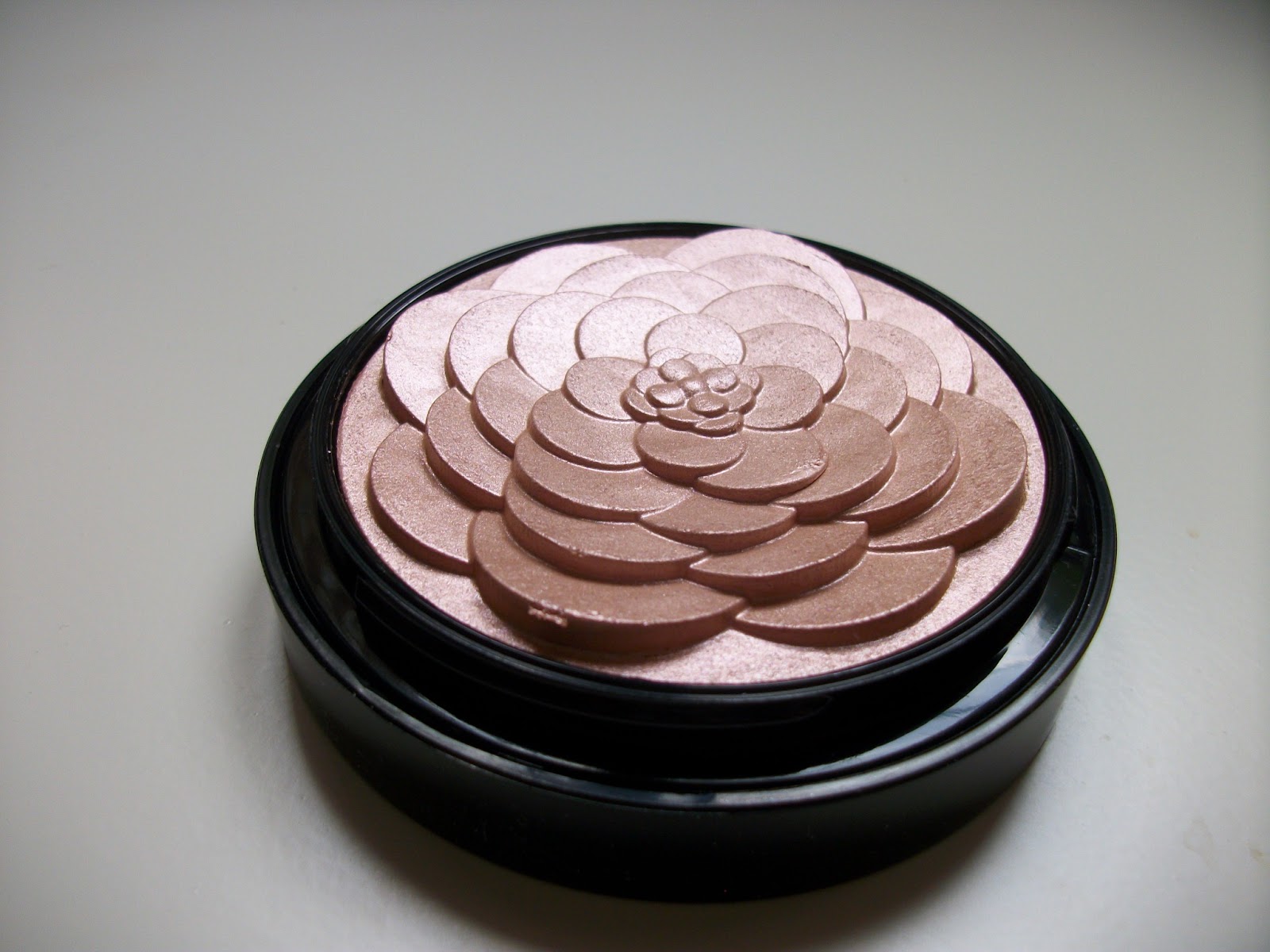Hormis la beauté du packaging, la couleur est juste parfaite pour ma carnation. C’est un enlumineur rosé et surtout très subtil.C’est le plus subtil de ma la collection, il ne contient pas de paillettes et reste très discret. Mais pour autant il apporte beaucoup de lumière au visage.La texture est très agréable, très veloutée et la tenue ne pose aucuns soucis. Je le dis haut et fort, cet enlumineur est mon préféré. Malgré son prix (exorbitant il faut l’avouer) le produit dépasse largement mes attentes. Même si j’avoue qu'au prix normal je n’aurais sûrement jamais craqué ! Seul point faible je trouve, la packaging: certes sublime, mais en plastique, pour un produit à 50 euros je trouve ça limite, surtout quand la plupart des autres produits sont souvent en métal.Malheureusement c’était une ancienne collection, l’hiver 2012 il me semble, vous ne pourrez donc pas le retrouver, ou alors pendant les soldes si il est en reste (pour mon cas c’était chez Marionnaud).