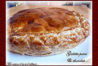 Bonjour et meilleurs voeux gourmands à tous...Je vous invite à déguster une galette... Un petit délice !!!Pour 8 personnes, il vous faut:2 disques de pâte feuilletée2 poires125 gr de poudre d'amande75 gr de sucre50 gr de beurre mou50 gr de ricotta140 gr de chocolat au caramel3 oeufs1 cuillère à soupe de laitDans un saladier, mélangez le beurre mou avec la ricotta, le sucre et la poudre d'amande. Ajoutez 2 oeufs un à un en mélangeant bien
