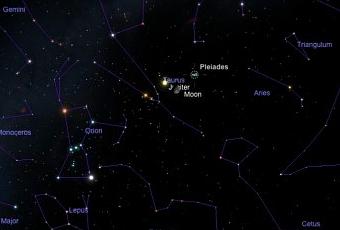 nuit du 21 au 22 janvier | La Lune rend visite au Taureau et, en premier lieu, au troupeau d’étoiles des Pléiades. Elle se rapproche progressivement de l’étincelante Jupiter en deuxième partie de nuit. Pour espérer observer l’amas (oeil nu ou paire de jumelles), il est nécessaire de masquer le « lampadaire » lunaire avec la main.
