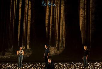 Représenté par un tapis de lumières au sol sur lequel marchent les acteurs, le feu embrase la forêt et dissout les individus : les répliques se succèdent sans attribution spécifique, au metteur en scène de distribuer la parole. La toile peinte, où sont représentés des arbres, cède la place à un immense cheval mort, gris de cendres. Du doré brûlant on passe progressivement au noir cendré et au blanc argenté, couleurs de la mort et de la tristesse, mais aussi de la fixation dans une a-temporalité. Une sorte de Pompéi naturel, qui confère une certaine beauté à l’horreur. « Ce n’est pas un hasard si dans Tristesse, les corps restent figés dans le vivant : la mort nous oblige à nous interroger sur le statut de la vie à l’œuvre », explique Nordey dans le programme. Les corps, ce sont d’abord ceux des six amis, méticuleusement décrits : les cheveux restés dans une main, les doigts de l’enfant calciné tombés à terre, le bras mort qui devra être amputé… et tous les animaux. Si à la première découverte du texte on est happé tout entier par ces descriptions factuelles, distanciées, qui jamais ne portent de jugement sur les personnages (tout point de vue moral est évacué), sur scène on se perd un peu dans cette parole de profusion, accumulation de détails et de sensation, rattrapé par les lumières et la scénographie. On se perd dans le vertige de la parole comme les personnages se perdent dans la forêt. Pas de spectaculaire, mais un tourbillon de mots qui figure à lui seul les flammes, avant la mort, celle de l’après-feu : « la ville ».
