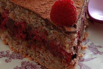 pour 8 personnes : 125 gr de poudre d'amandes 125 gr de poudre de noisettes 6 blancs d'oeuf 250 gr de sucre en poudre 12,5 cl de crème fraîche mini 35% MG 150 gr de chocolat noir 2 barquettes de framboises cacao