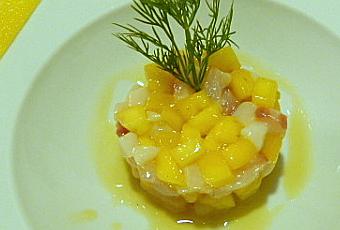 Les ingrédients pour 6 tartares : 1 bar, 5 belles noix de Saint Jacques, 1 mangue, 1 citron vert, gingembre, baies roses, huile d'olive, vinaigre de passion, aneth, sel et poivre.