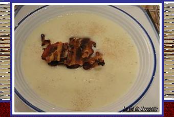 Ingrédients : 7 panais moyens - 1 échalotes - 2 c à s d'huile d'olive - 1l de bouillon de légumes - 2 grosses pincées de cannelle - 20cl de crème liquide - 2 c à c d'huile de noisettes de noix - 2 tranches de lard fumé -fleur de sel et poivre du moulin.