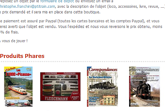 Le principe est que si vous souhaitez mettre en vente votre objet - loco, voiture, wagon, voie, revue etc... -, vous remplissez le formulaire de dépôt, je le poste dans la boutique, vous attendez la vente, la transaction se déroule par un paiement en ligne sécurisé (CB ou Paypal), puis je vous avertis de la vente de votre ou vos objets.