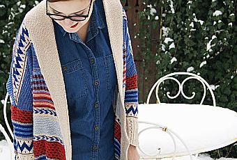 Un jean noir bien taillé, une chemise en jean (un classique dont je suis amoureuse, mais par pitié, pas avec un jean), un gros gilet bien chaud et coloré (pièce maîtresse du look) et des bottines fourrées : rien de mieux pour affronter le froid tout en étant sortable. Oui, parce que, sinon, j'affronte le froid sur mon canapé, avec mon sweat grincheux et mon peignoir à poids, faut pas croire.