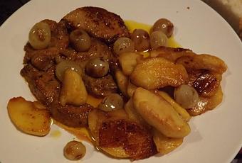 Dans une poêle faire chauffer une noix de beurre mettre les pommes à cuire 5 minutes puis, leurs adjoindre les grains de raisin, saler et poivrer, réserver au chaud