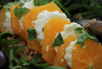 Je me rends compte qu'en ce moment je ne publie que des recettes dans les tons d'orange , mais que m'arrive -t-il ? un manque de lumière c'est certain et un besoin de couleurs dans ma cuisine , oui sûrement aussi . A Vienne nous avons froid , un ciel gris depuis plus d'une semaine , de la neige dans notre jardin qui ne fond pas et avec les températures annoncées nous allons la garder encore quelques jours c'est certain . Alors c'est vraiment le moment où il faut se faire plaisir , je n'ai pas dit manger du chocolat toute la journée même si je reconnais c'est très réconfortant ... Non j'ai plutôt envie de belles assiettes avec des couleurs , de prendre des forces avec des sucres lents , de me doper avec des vitamines ... alors voilà avec toutes ces idées/envies je vous les propose une super salade colorée , vitaminée et consistante . En effet sous l'orange mozzarella , j'ai déposé de l'orge (juste assaisonné d'huile d'olive ) tiède , ensuite le mariage fruit frais / fromage , un peu de menthe pour dynamiser et des olives et de la roquette pour faire beau...