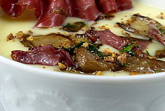 Les ingrédients : 600 gr de pommes de terre Amandine, 2 oignons, 1 l de bouillon de volaille, sel, poivre, 10 cl de crème liquide, cèpes, magret de canard fumé, 1 gousse d'ail, 1 noisette de beurre, persil, chapelure de châtaigne.