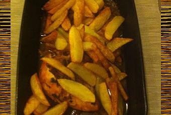 Pour 4 personnes- 1 poulet* de 800 g découpé en 4- 4 brins de coriandre en feuilles* entiers- 1 gros oignon* ou 2 moyens- 3 gousses d’ail*- 2 cuillères à soupe d’huile d’olive*- 2 cuillères à café de gingembre* en poudre- 1 cuillère à café de curcuma*- 2 brins de safran* naturel (facultatif)- 2 cuillères à café de sel- 1 grand verre d’eau- Pommes de terre* pour frites