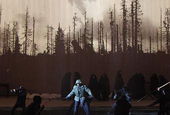 Cette domination féminine on la constate dans le premier acte, où le plateau est envahi de femmes, ou bien sûr dans le dernier acte, dans la scène finale où les servantes portent le bûcher et se blottissent aux pieds de Brünnhilde endormie, enserrées elles-aussi dans les flammes, et surtout dans cette chevauchée initiée par un ballet "a capella" sans orchestre, où les "servantes" au milieu de corps empalés frappent martialement du pied, seul bruit admis, et entament une longue chorégraphie rythmée qui a pour résultat de pousser le public à la guerre: cela a commencé par un "ça suffit" compris par la partie francophone de la salle, puis par un "basta" compris par les italophones et non, et puis par des cris divers, des mouvements violents qui chauffent la salle à blanc pour entendre ensuite une chevauchée guerrière et sauvage à souhait. Il faut applaudir à l'ironie du metteur en scène et à sa manière de préparer la salle à la scène de la chevauchée, que tout le monde attend, et qui elle-même est si ironique (comme Coppola en avait bien compris le sens dans "Apocalypse Now"!), une sorte d'apologie de la sauvagerie dans un acte qui finit par une sorte d'apothéose d'amour. Ce que le public attend dans la Walkyrie, c'est un chœur de femmes sauvages!