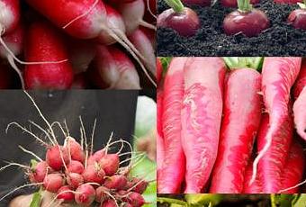 - Rose : radis rond gaudry, radis rond de sézanne, radis rond rose à bout blanc, radis demi-long de 18 jours, radis rose d’hiver de chine, radis rose de pâques,