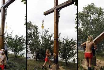 Photo: le 18 août 2012 à Kiev, des féministes ukrainiens du FEMEN menés par Inna Chevtchenko, ont scié à la tronçonneuse une croix catholique érigée en mémoire des victimes du stalinisme jusqu'à la faire tomber. Le 26 juillet, une militante de ce mouvement, seins nus et avec les mots « Kill Kirill » (Tuez Kirill) écrits en lettres noires sur son dos, s'était jetée sur le patriarche orthodoxe en visite en Ukraine.