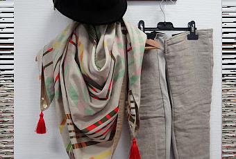 Pour éviter les torticolis et se protéger du froid, un grand carré doublé en coton et coton bio, accessoirisé de pompons carmin, de Syho.