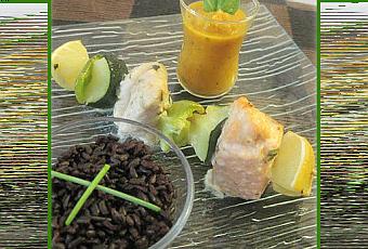 Servir les brochettes de poisson, avec le coulis de courgettes et tomates à part et du riz (j'ai utilisé du riz noir vénéré).