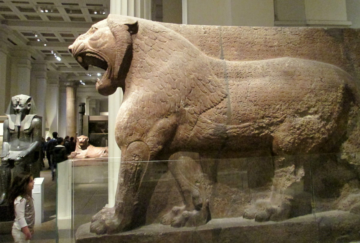 Il s'agit d'un lion colossal, qui gardait l'entrée du temple d'Ishtar, à Nimrod, qui date d'environ 2900 ans. Une fois de plus, on peut voir qu'il est couvert d'écriture cunéiforme. Sur cette photo, j'ai voulu accentuer l'échelle du lion en le captant avec la petite fille devant lui, qui semble captivée par une telle présence.
