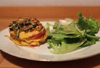 Placer 4 cercles sur une plaque à four recouverte d'une feuille de silicone. Au fond de chacun, poser une omelette. Recouvrir de jambon blanc, remettre une omelette, étaler les tranches de tomates, recouvrir d'omelette, parsemer de laitue (ou endive) émincée avant de placer la dernière omelette. Recouvrir de courgettes puis parsermer de fromage.