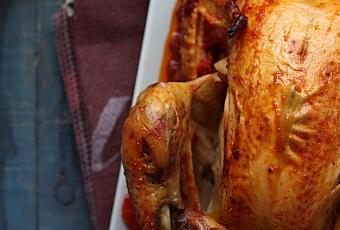 7- Faites préchauffer le four à 200°C enfournez le plat pour 20 min, passé ce temps, baissez la température à 180°C et poursuivez encore 1 h. Durant le temps de cuisson, arrosez régulièrement le poulet avec les tomates. Si nécessaire, ajoutez un peu d’eau.