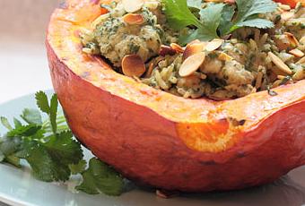 - Farcir les deux moitiés de potimarrons avec la garniture préparée précédemment. Servir arrosés du reste de lait de coco. Ajouter les amandes grillées, plein de coriandre fraiche, le reste du gingembre haché et de bonnes pincées de paprika.