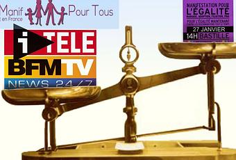 En cette journée de différence, de toutes les différences, je constate. BFMTV a décidé de ne pas faire son direct sur la Manif pour l'égalité quitte à lui préférer le Vendée Globe, ce qui crée un colossal écart de communication face à la Manif pour tous qui avait elle eu droit à une journée complète en temps réel et en informations non vérifiées pour la plupart (du style un million de participants). Vers 18h30 tout à l'heure, cette même chaîne mentionnait enfin la Manif pour le mariage en montrant, là en direct, la fin du regroupement.