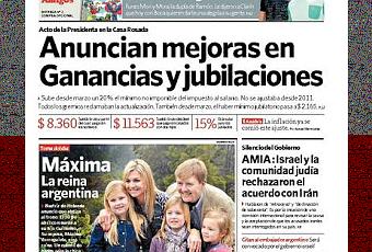 Tandis qu'en une, Clarín (1) nous la joue convenue et terriblement nunuche, avec un ton et un contenu digne d'une midinette de 16 ans, La Nación consacre à la princesse héritière des Pays-Bas un véritable dossier d'une tenue convenable (en une aussi) pendant que Página/12 relègue l'info au fin fond de ses pages intérieures, en rappelant d'une manière assez insistante les liens familiaux de la dame avec la Junte militaire des années 1976-1983 (on s'en souvient, Jorge Zorreguieta, son père, fut un ministre de l'Agriculture de la Dictature, à l'heure où ce portefeuille était tenu de fait par la Sociedad Rural, dont il avait été l'un des principaux dignitaires, ce qui le rend passablement antipathique aux yeux des militants des droits de l'homme et de la gauche dans son ensemble). La dépêche de l'agence nationale Télam est encore ce qu'on fait de plus objectif sur cette nouvelle...