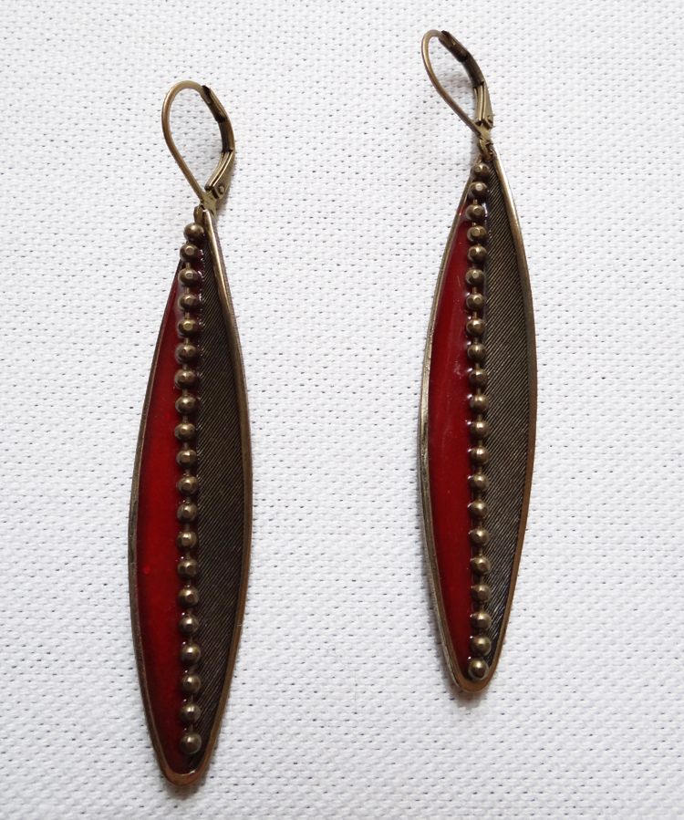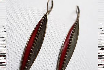 Longue feuille stylisée, composée d'émail rouge, de perles et de stries.