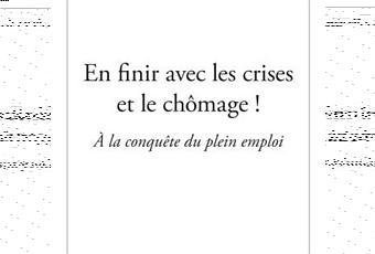 En finir avec les crises et le chômage ! (A la conquête du plein emploi). C’est le titre du livre qui vient d’être édité chez Edilivre.com (version numérique et/ou papier). Il aurait pu s’intituler aussi « Comment franchir le mur d’argent élevé par le néolibéralisme ». Il propose des solutions techniques qui consistent à donner la priorité à la stratégie originelle de la demande, celle du système économique lié au travail et non à celle de l’offre non régulée qui conduit immanquablement aux crises. L'auteur termine en montrant qu’un avenir est encore possible, à condition de réhabiliter les forces du travail. Les « indignés », altermondialistes et autres humanistes, devraient y trouver du grain à moudre. C’est un message finalement optimiste que l'auteur espère transmettre aux jeunes générations.