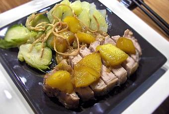 - Quand le rôti est cuit, dresser les assiettes en coupant chaque tranche de viande en lanières d’un centimètre d’épaisseur. Napper de sauce et décorer de quelques morceaux de mangue, enfin parsemer de kiriboshi daikon.