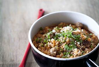 Risotto au Tomacouli®, saucisse et petits poisPréparation :10 min