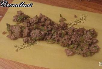 Monter les cannellonis, deposer de la viande sur la pate et rouler puis deposer dans un plat a gratin.