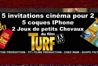 (qui servira uniquement pour envoyer vos lots) - Un tirage au sort dévoilera les 5 gagnants qui remporteront chacun : une invitation pour deux personnes pour aller voir le film "TURF" + 1 coque IPhone 4/4S. Les deux premiers de ce même tirage, remporteront en plus un jeu de "petits chevaux".