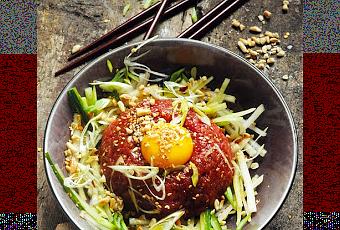 La cuisine Coréenne grâce à toutes ces petites choses est ainsi finalement entrée dans la mienne et n'est pas près de la quitter !Du coup aujourd'hui premier voyage dans la cuisine coréenne avec un tartare diablement parfumé, le Yukhoe Le Yukhoe le tartare comme au pays du matin calmeIngrédients : 500g de viande de bœuf – 4 jaunes d'œuf -1càs de pignons – 1càc de graines de sésame – 1 poire Nashi coupée en julienne –1/2 tasse de concombre coupé en julienne – 1 oignon nouveau finement émincé