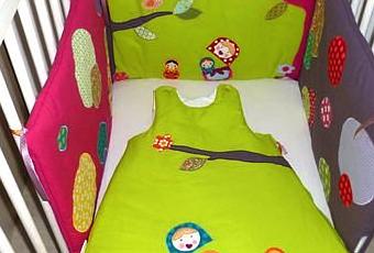"On veut l'appeler Félicie donc je pense à quelque chose de coloré et joyeux !"... C'est en ces termes que Jacinthe commença à me décrire son "envie" de gigoteuse personnalisée, ainsi que de son tour de lit assorti. Après réflexion, elle continua à me donner des pistes de travail : "J'ai pensé au thème des poupées russes, car je viens de chiner une petite robe en vide grenier avec des petites poupées mignonnes et colorées, les fleurs et les petits oiseaux qui vont avec sont aussi mignons..."