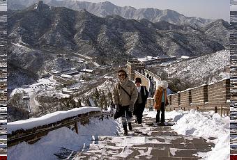 Sur la muraille de Chine en novembre 2003.L’air est glacial, environ une dizaine de degrés en dessous de zéro. Le vent vif vient en souligner les morsures. Le neige, tombée il y a quelques jours, recouvre le paysage et fournit un miroir aux rayons du soleil.Tout autour de moi, un paysage de montagnes qui se chevauchent à l’infini. Pékin, qui n’est pourtant qu’à un peu plus de cent kilomètres, est bien loin. Aucun bruit, aucune pollution, et Dieu merci comme c’est l’hiver et que la température n’est pas clémente, il n’y a quasiment personne à part nous deux.