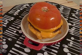 Ingrédients (pour 2)- 2 steaks hachés- 2 grosses tomates- 1 oignon- 4 tranches fromage à hamburger- sel, poivreRecetteLaver les tomates. Les couper en 2 et les creuser légèrement.Les placer dans le four à 180° durant 10 à 15min (selon les tomates).Éplucher et émincer l'oignon. Le cuire dans une poêle avec un peu de matière grasse.Ajouter les steaks à la cuisson des oignons.Assaisonner.A la fin de la cuisson, disposer une tranche de fromage sur les steaks.Disposer les autres tranches sur la base de la tomate.Placer les steaks sur les tomates, parsemer d'oignons, puis recouvrir avec le chapeau de la tomate.
