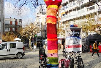 Clic-clac 3*13 - Yarn bombing Liège. ici L'hiver arrive, les arbres aussi mettent leurs petites laines .