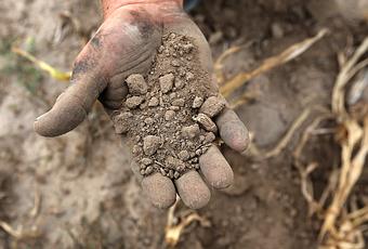 Darren Becker tamise la couche de terre arable asséchée d’un des champs de la ferme familiale le 24 août 2012 à Logan dans le Kansas. Comme de nombreux agriculteurs texans dont les profits ont été anéantis par la sécheresse record, les Beckers travaillent dur pour maintenir leur ferme, dans la famille depuis cinq générations © John Moore/Getty Images