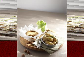 Ingrédients : Un camembert au four vendu dans le commerce • Une dizaine de pommes de terre Ratte du Touquet • Amandes caramélisées au sésame • Noix et noisettes • Salade verte