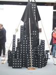 Droit devant, cette sculpture de Mounir Fatmi, Babel House /Empire reprend les cassettes vidéo d’un noir luisant vues à la FIAC, mais les élève jusqu’au ciel. Cette tour ornée de drapeaux noirs sur des manches à balai géants pourrait bien être un bûcher, la ruine des ambitions humaines. Un panneau gît à terre, comme si son porteur avait été terrassé, s’était évanoui : “Those who can still dream do not sleep anymore” : une phrase d’apocalypse, de fin du genre humain. Comme souvent avec Fatmi, une oeuvre énigmatique, inquiétante et poétique, dont la force éclate au visage.