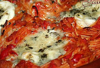 Placez les spaghettis dans un plat à four en les tournant avec une fourchette pour former un nid, posez un œuf poché au centre, arrosez de gorgonzola fondu, enfournez 5 minutes.