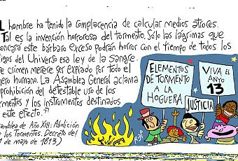 Les pancartes brandies par les manifestants de toutes les conditions sociales et raciales qui formaient la société très bigarrée des années révolutionnaires dans l'actuelle Argentine, disent : "Instruments de torture au bûcher Justice Vive l'An XIII !" (Traductions Denise Anne Clavilier)