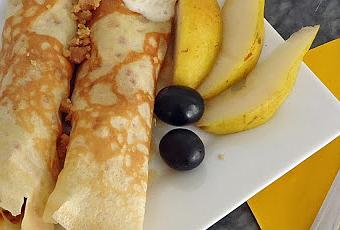 Juste à temps pour le petit déjeuner de la Chandeleur, voici des crêpes toute simples, remplies de poires caramélisées à la poêle, servies avec une rosette de Chantilly, un crumble de sucre et un filet de sirop d'érable...(pour la petite touche québécoise).
