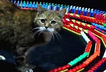 La spirale de dominos va être suivie de près par Shammy. Il y aura deux bugs, vite réparés pour que notre chat poursuive sa quête circulaire.